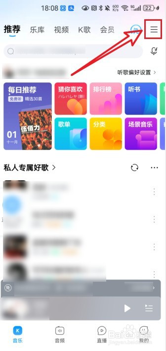 打开酷狗音乐主页,点击右上角的【三横杠】。