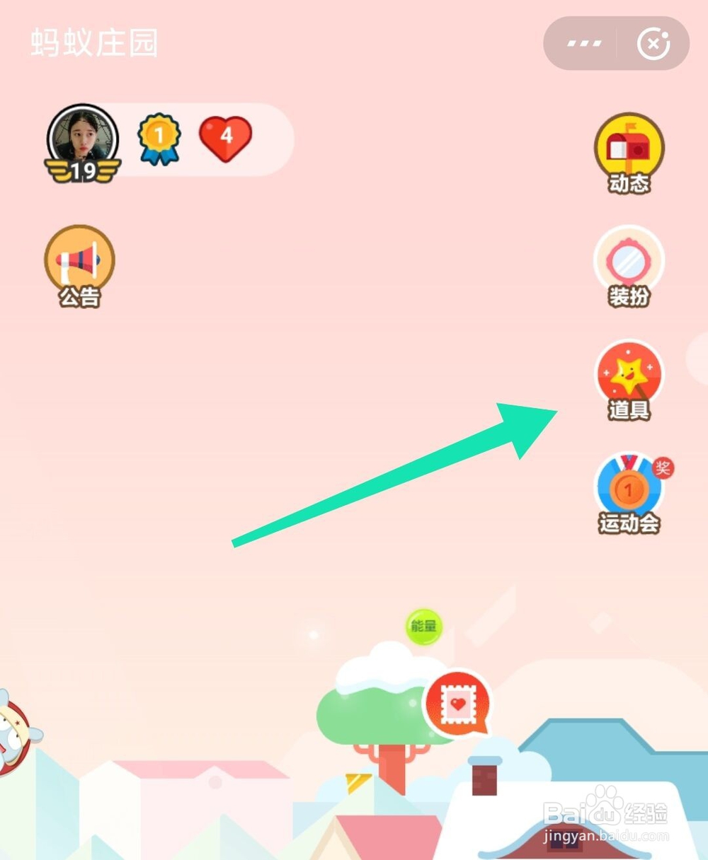 来到蚂蚁庄园页面,我们点击右侧的道具;
