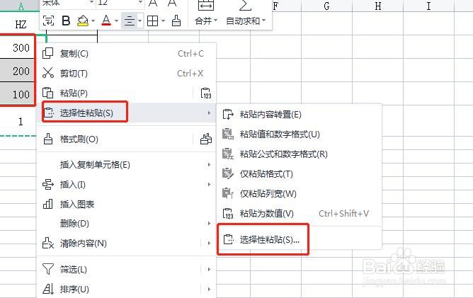 选中要转化的数值区域,单击鼠标右键,单击选择性粘贴,打开选择性粘贴对话框。