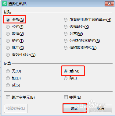 在“选择性粘贴”窗口中,在“粘贴”选项中选择“数值”,在“运算”选项中选择“乘”,点击“确定”。
