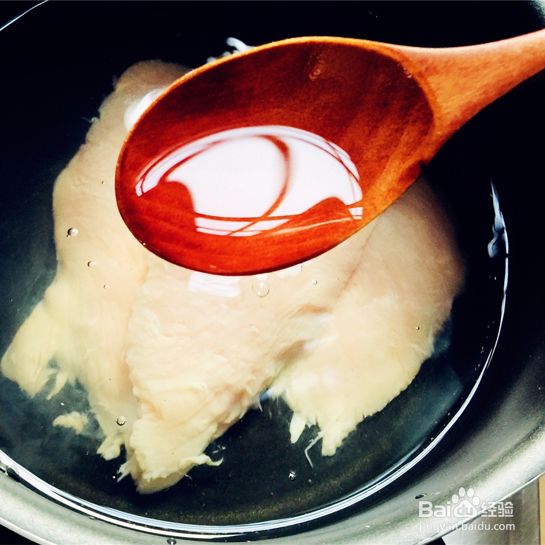 把鸡胸冷水入锅,加米酒煮熟捞出。