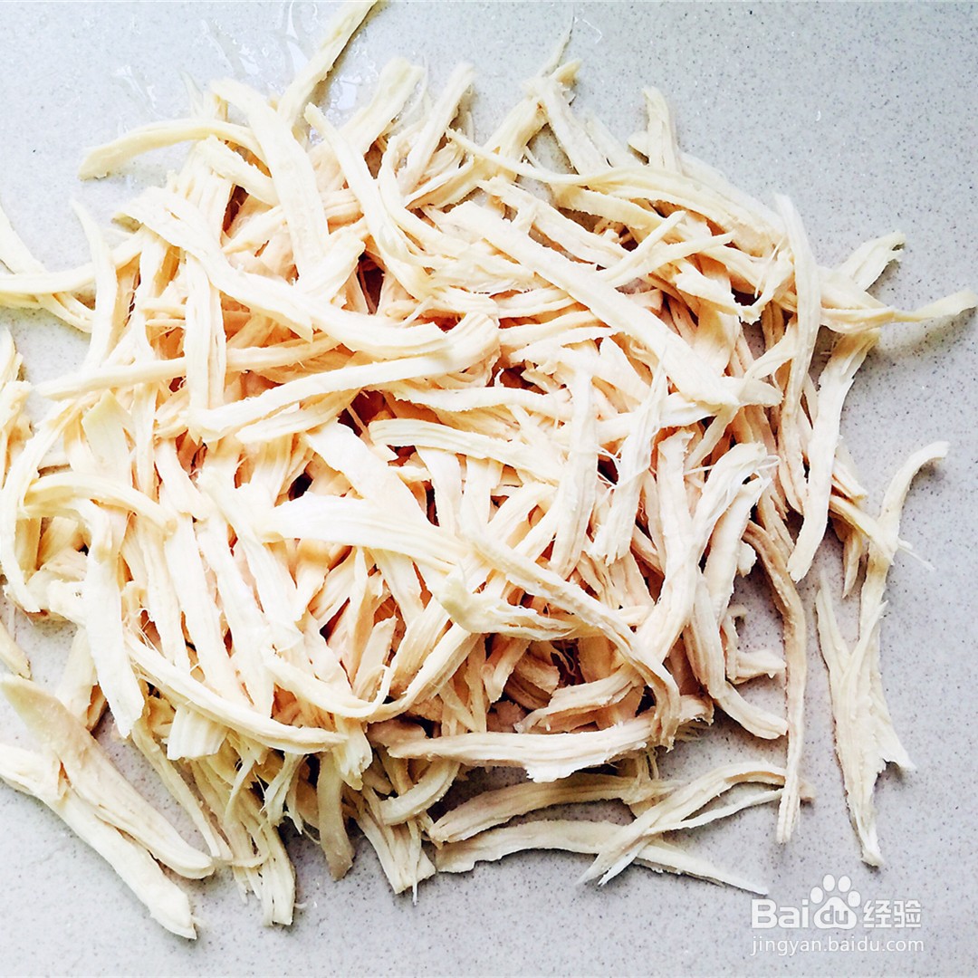 把鸡胸肉稍微放凉,掰成鸡丝备用。