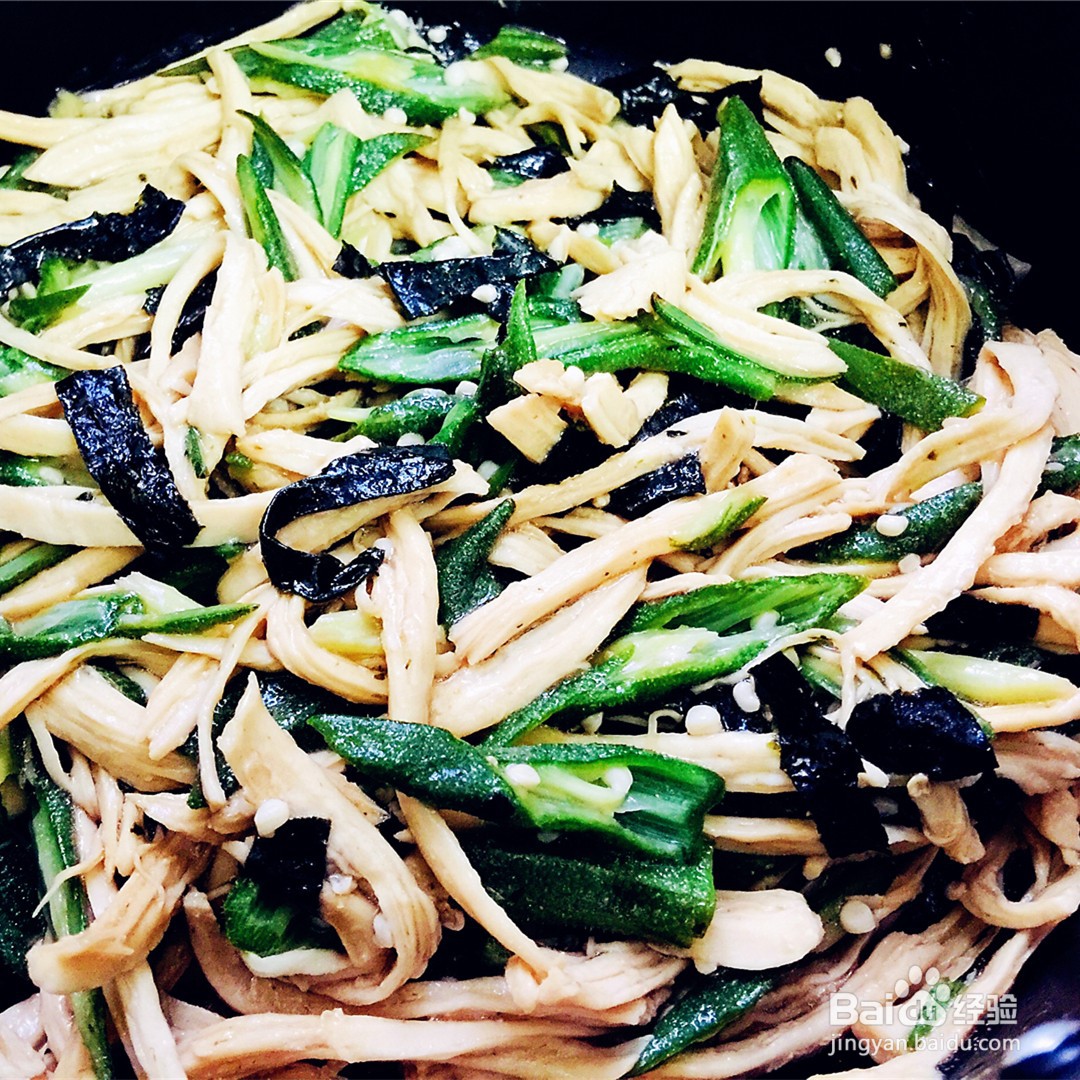 最后把鸡丝和秋葵下锅,拌炒均匀下海苔丝,搅拌几下即可。
