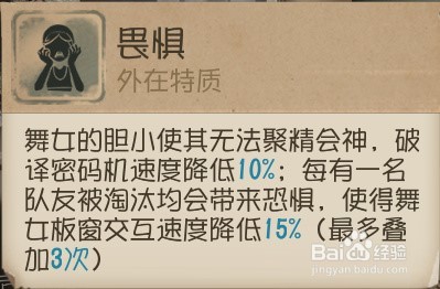 舞女的定位跟魔术师啊调香师啊一样都是修机位。技能的作用也是避免太快被打晕。而八音盒跟魔术棒啊香水啊等道具的作用也一样,都是为了拖延监管者的时间。只要不被追上,被踩掉又如何呢?香水魔术棒不也是用一下就没了
