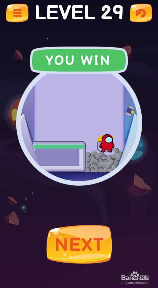 红衣宇航员得到宝箱,弹出YOU WIN的通关动画,如图,这样就过关了。