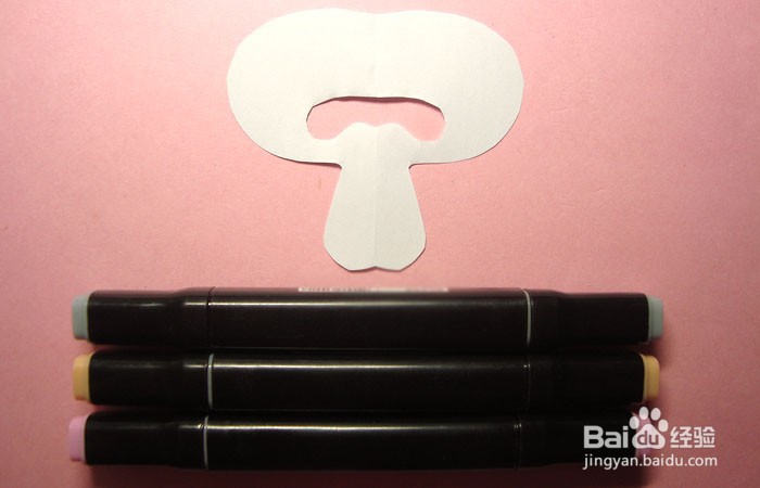然后,把好看的蘑菇图形的剪纸,展平,摆放在桌子上,并选择浅红色和灰色、棕色的马克笔,准备涂上颜色,如下图所示。