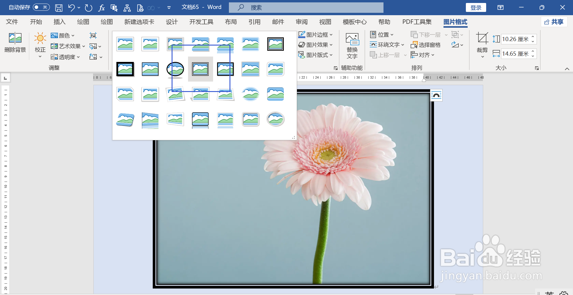 打开WORD文档,选中要添加框架的图片,点击菜单栏上”图片格式“。