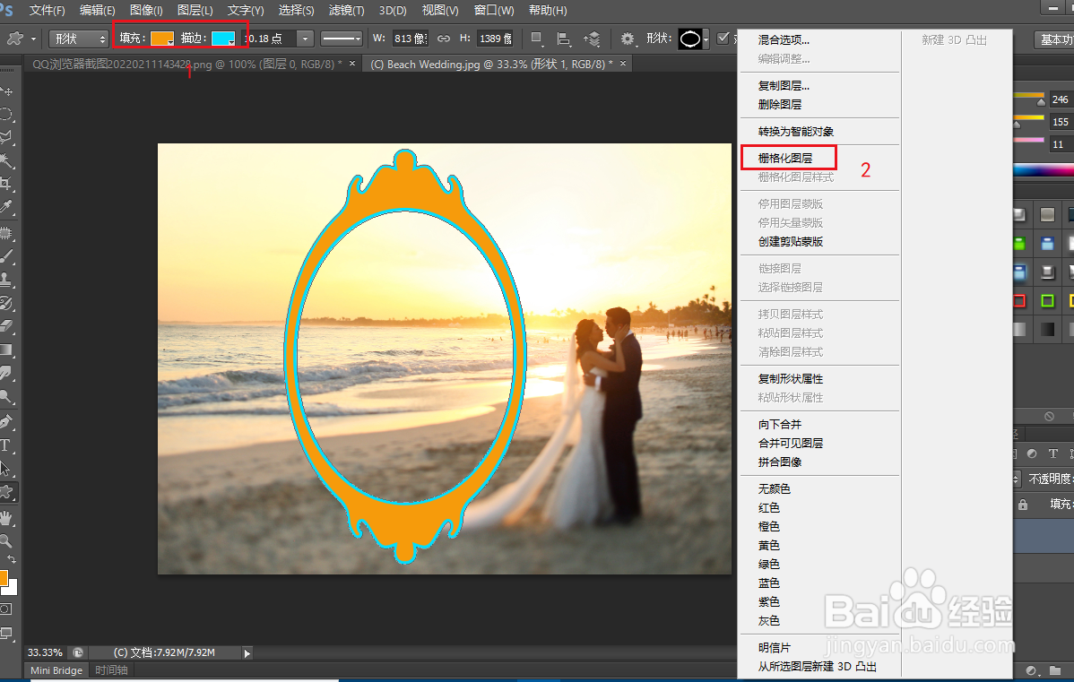 在选项栏选择填充和描边的颜色。在图像上拖拽创建边框,然后栅格化形状图层。
