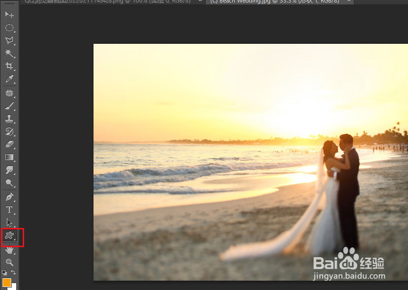 用快速选择工具选择边框以外的区域,然后点击键盘删除键。边框添加完成,