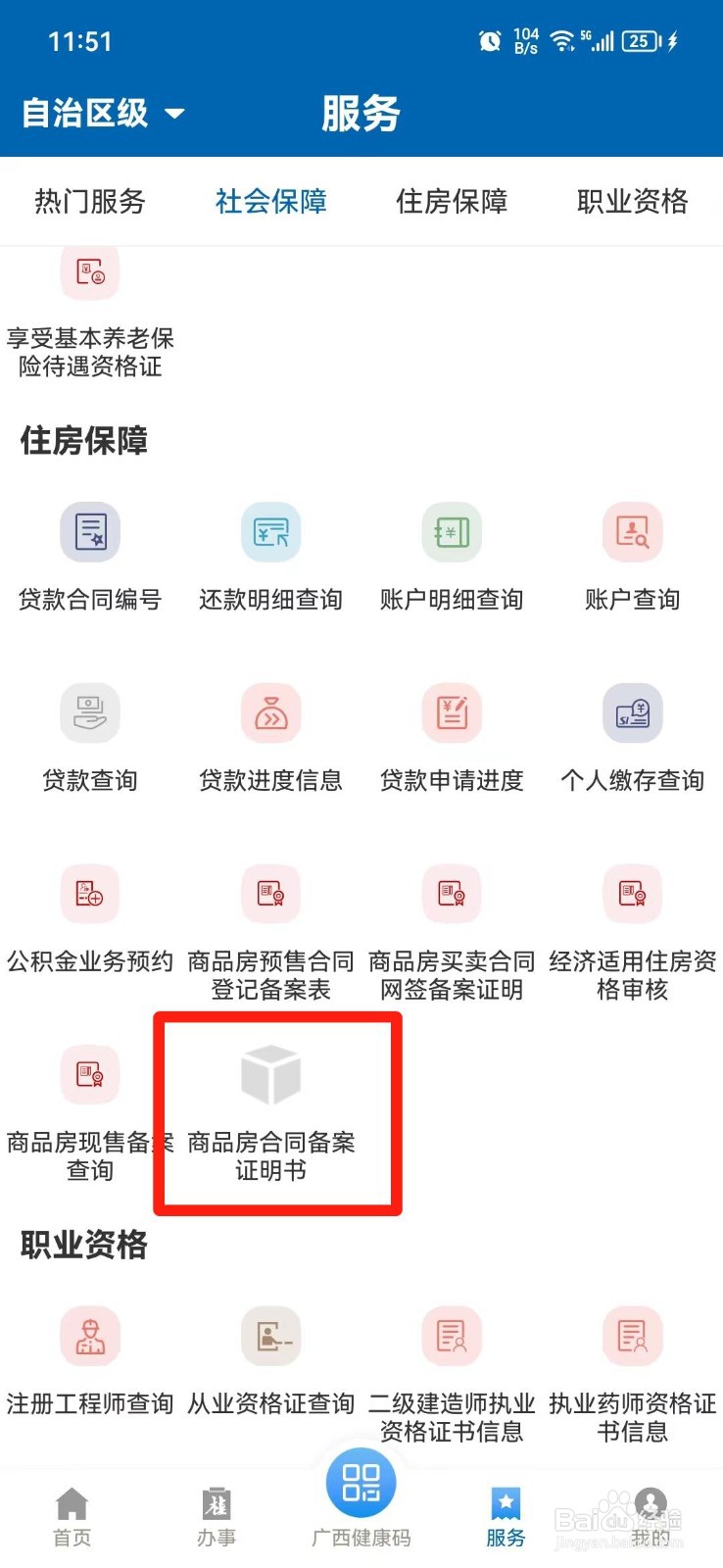 第二步:在住房保障界面下点击【商品房合同备案证明书】