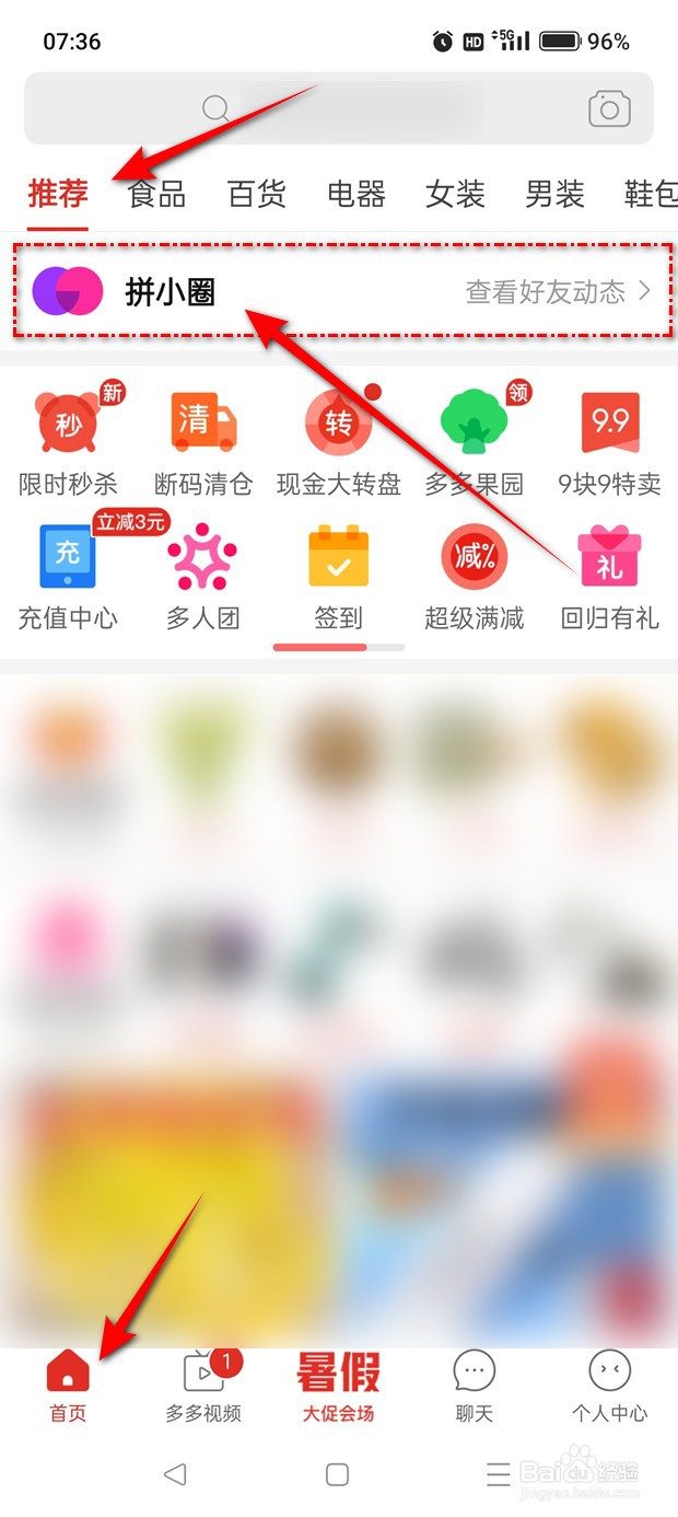 打开拼多多首页,点选“推荐”,点击“拼小圈”图标进入。