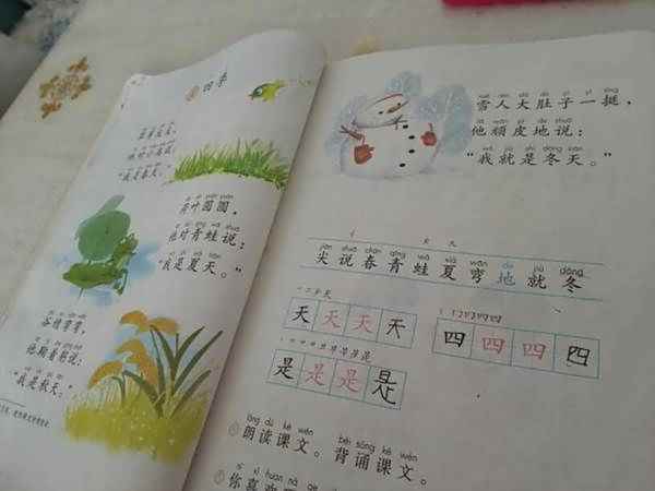 小学一年级语文学说话:春天草芽尖尖,春天荷叶圆圆,夏天荷叶圆圆,秋天谷穗弯弯,冬天白雪皑皑,冬天冷风飕飕,夏天暴雨刷刷,秋天秋风瑟瑟,冬天冷风阵阵。