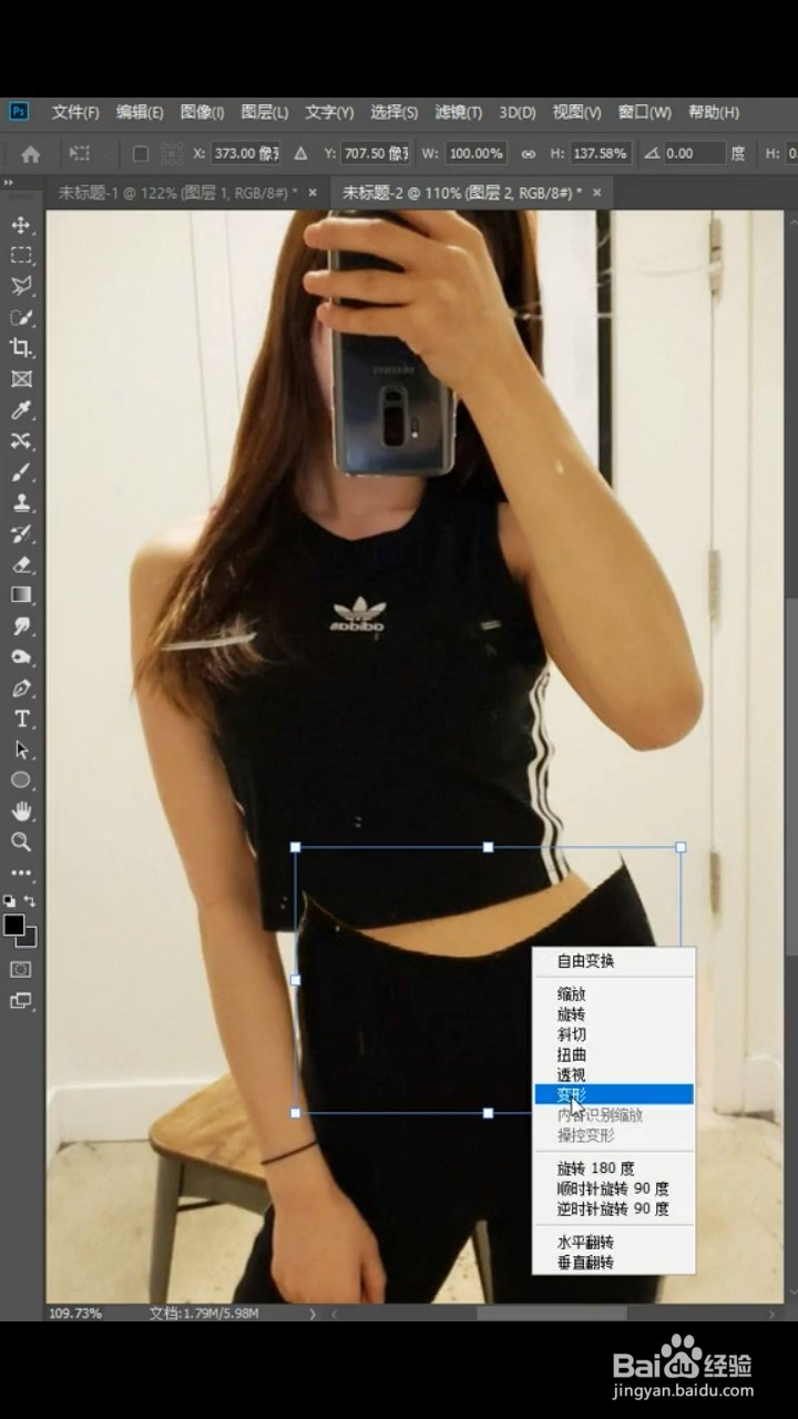 按Ctrl+T,将裤子向上拖,右键,选择变形,然后将裤子调整到合适的位置,即可完成。