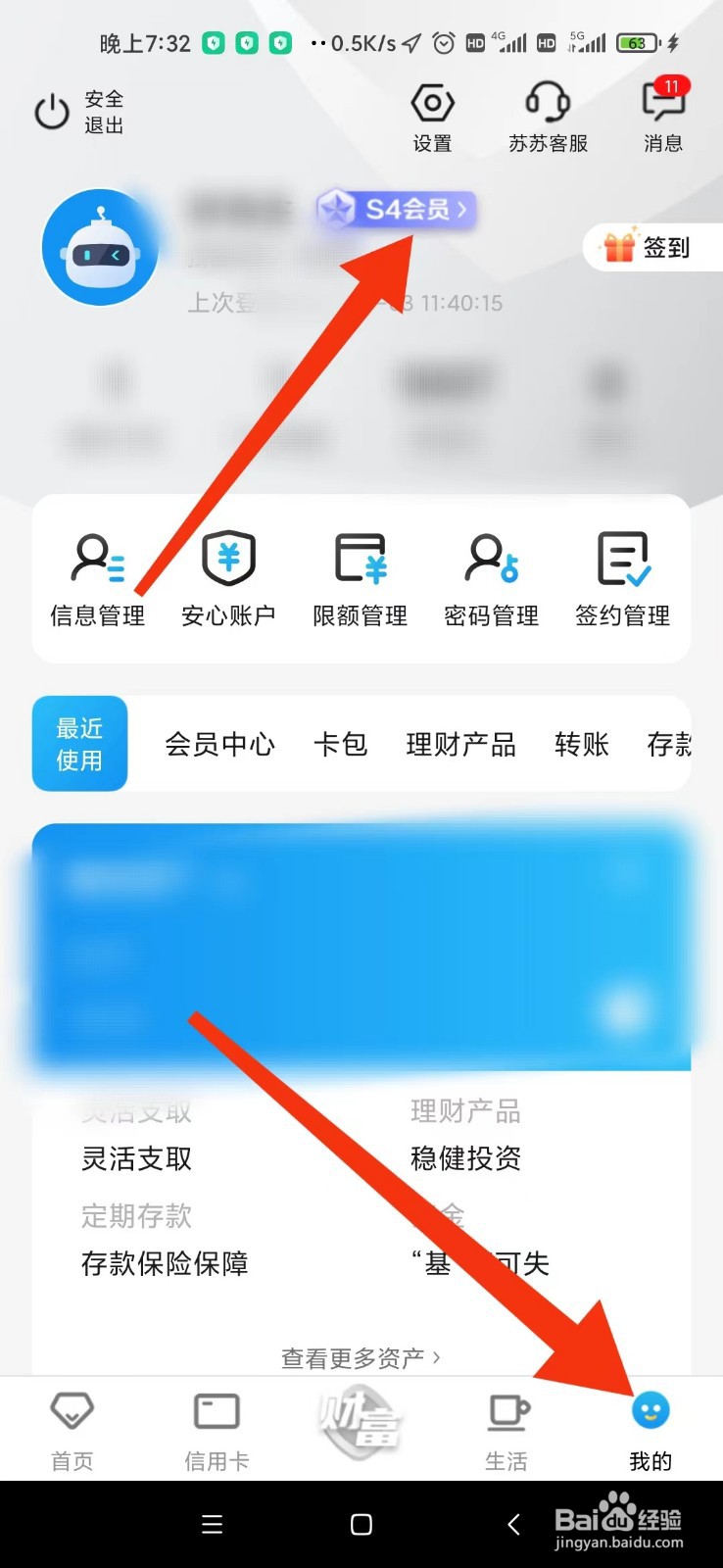 打开江苏银行app,登录账号,点击我的,再点击S4会员。