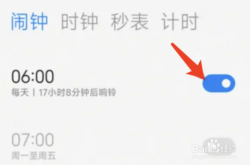 然后,我们在闹钟管理界面中,点击右侧的蓝色的圆点按钮;