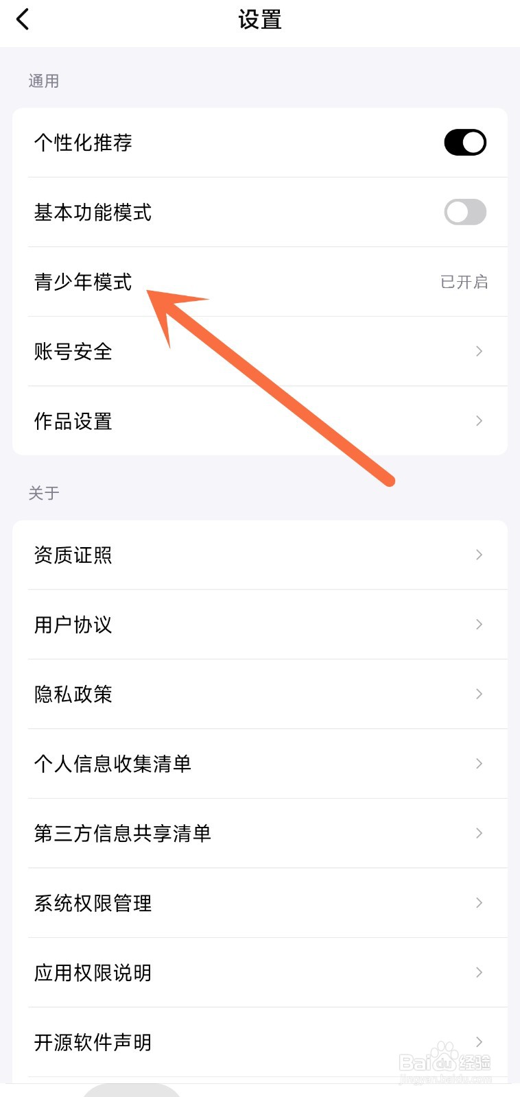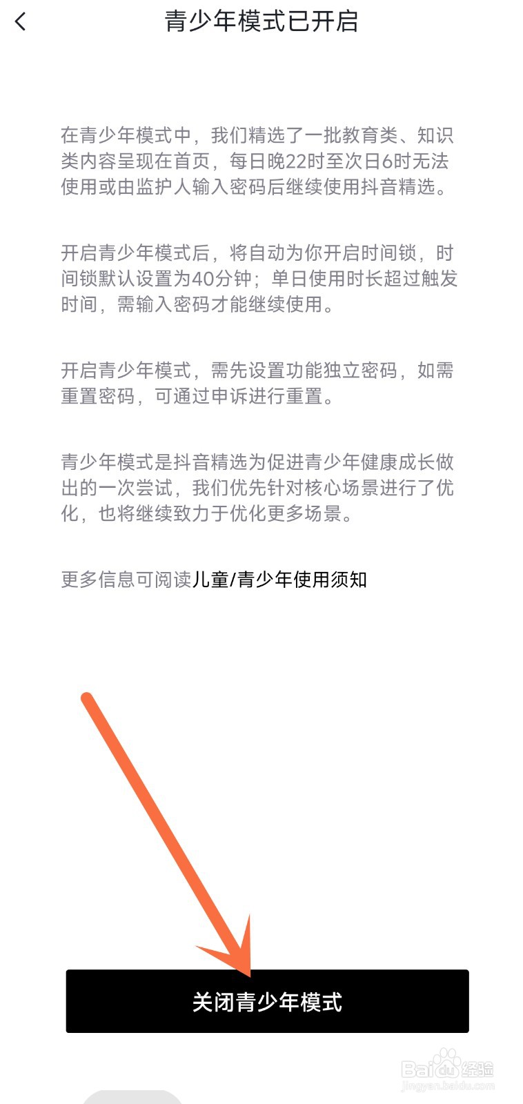 进入青少年模式页面,阅读页面提示,点击下方的关闭青少年模式。