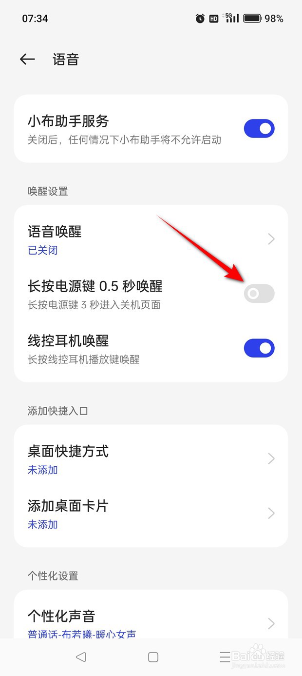 将“长按电源键0.5秒唤醒”旁的小滑块点暗即可关闭。