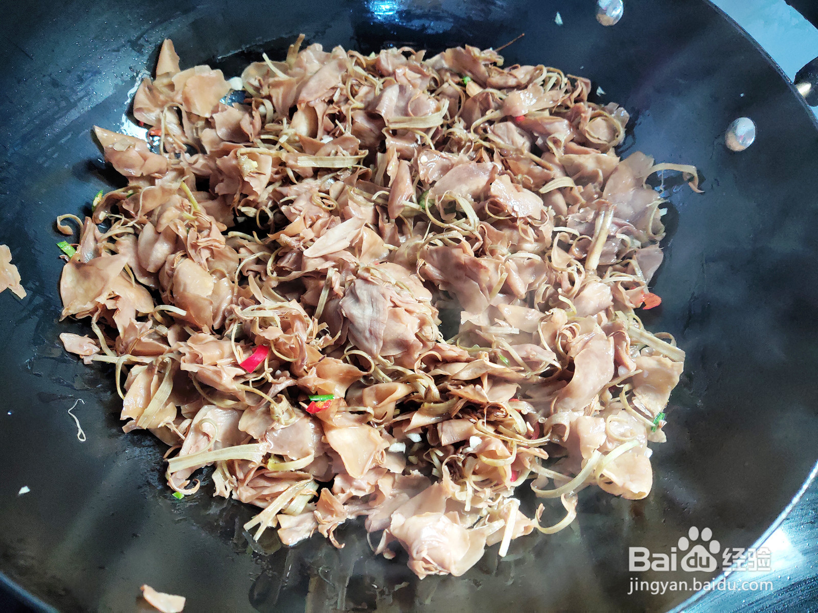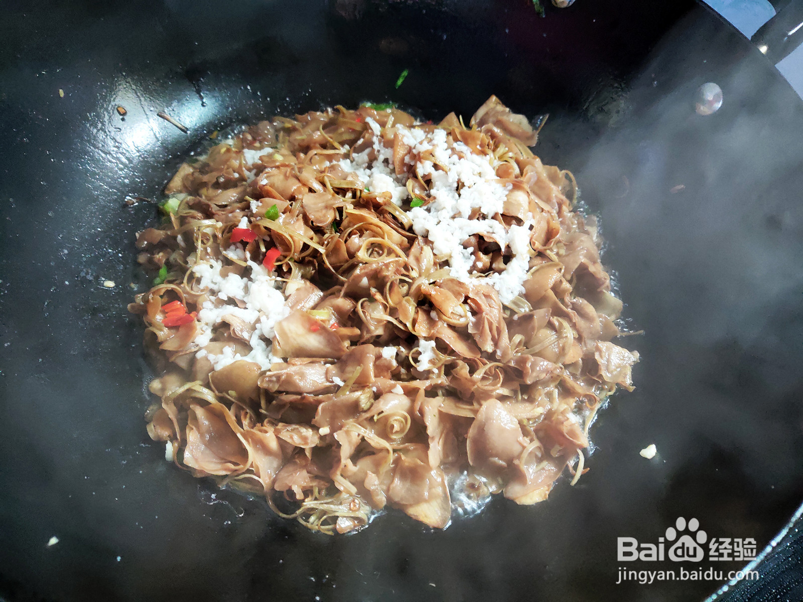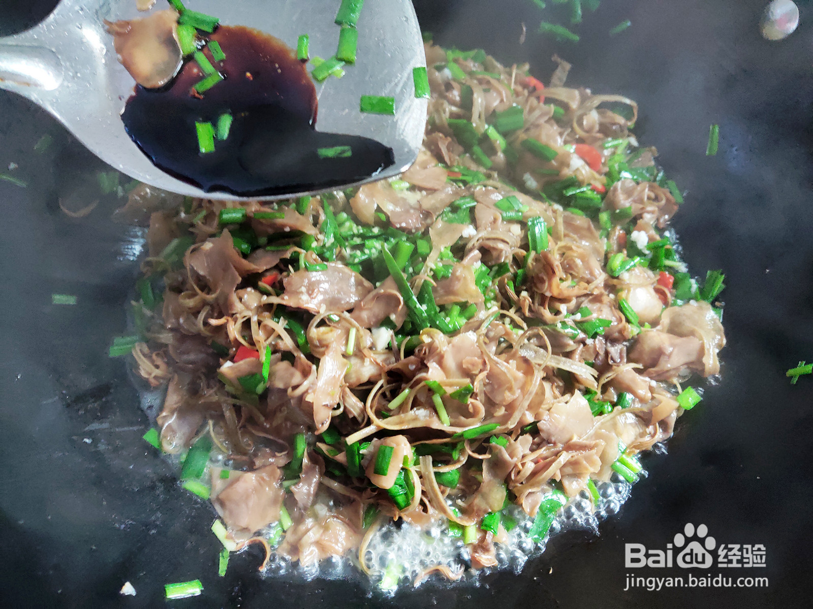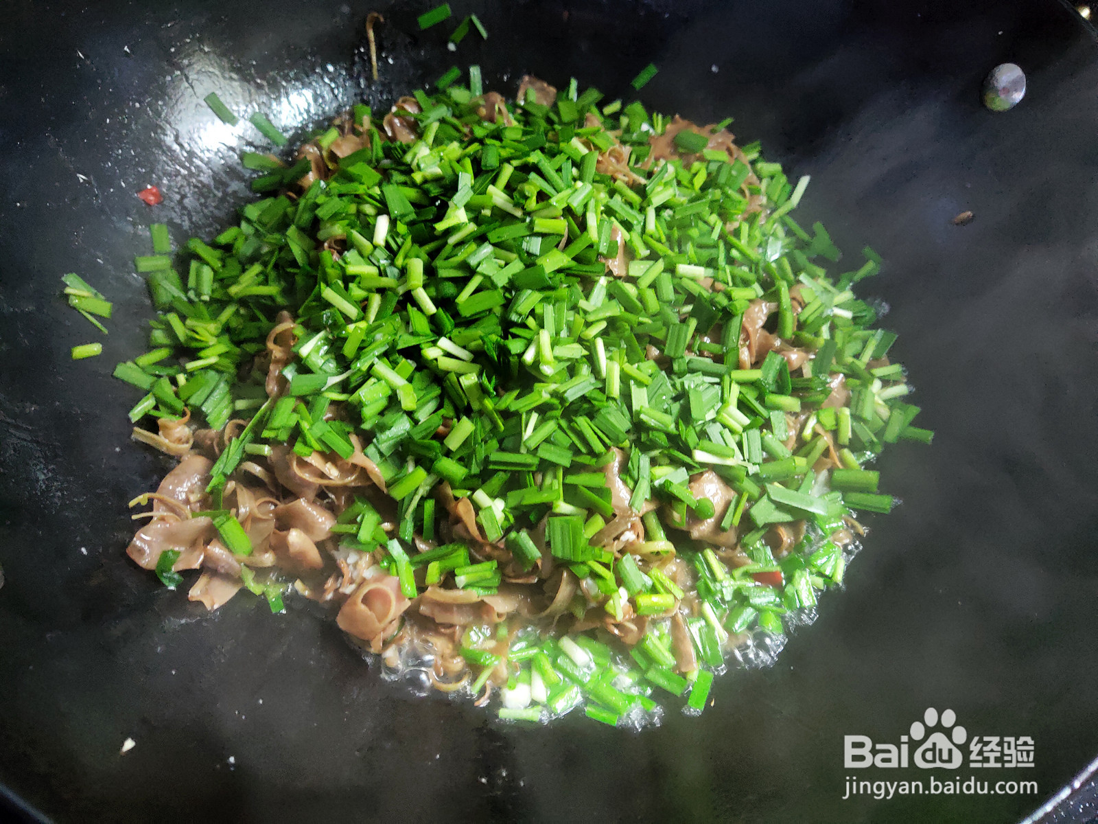 开盖加入韭菜末,翻炒至熟。