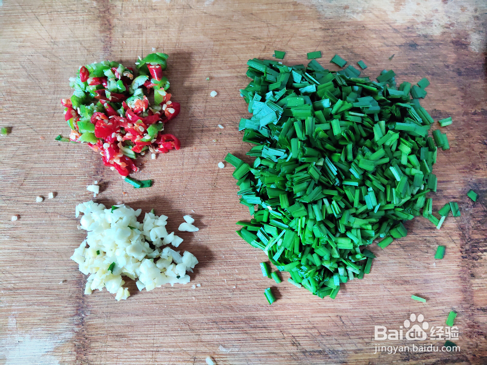 韭菜、辣椒和姜蒜准备好,都切碎。