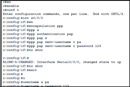 5、 配置路由器c带pap认证的PPP协议,配置命令是: