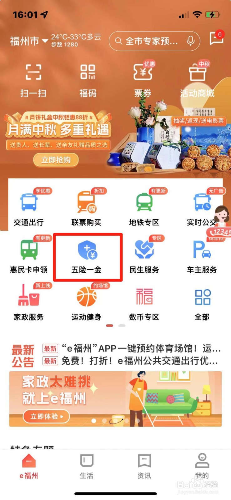 第一步:打开【e福州】APP,在首页点击【五险一金】。