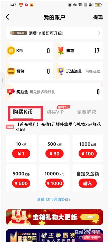 首先打开全民k歌软件进入全民k歌页面,然后点击右下角的改彩【我】,来到我的页面后看到【k币账户】点击进廊彩欠入;伐囊