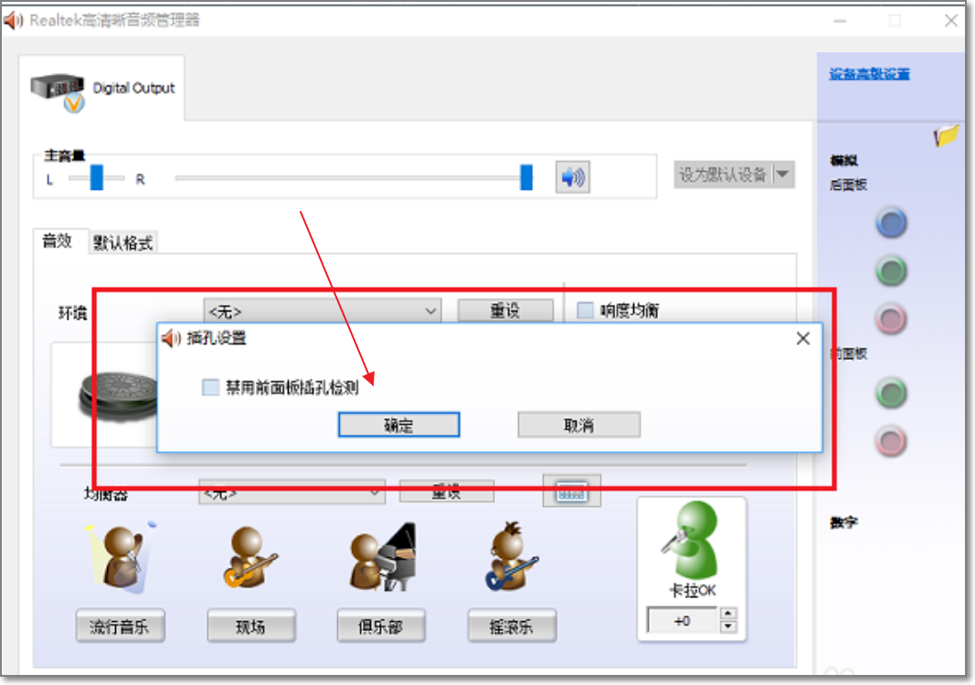 5.点击勾选“禁用前面板插孔检测”,点击确定,如下图所示: